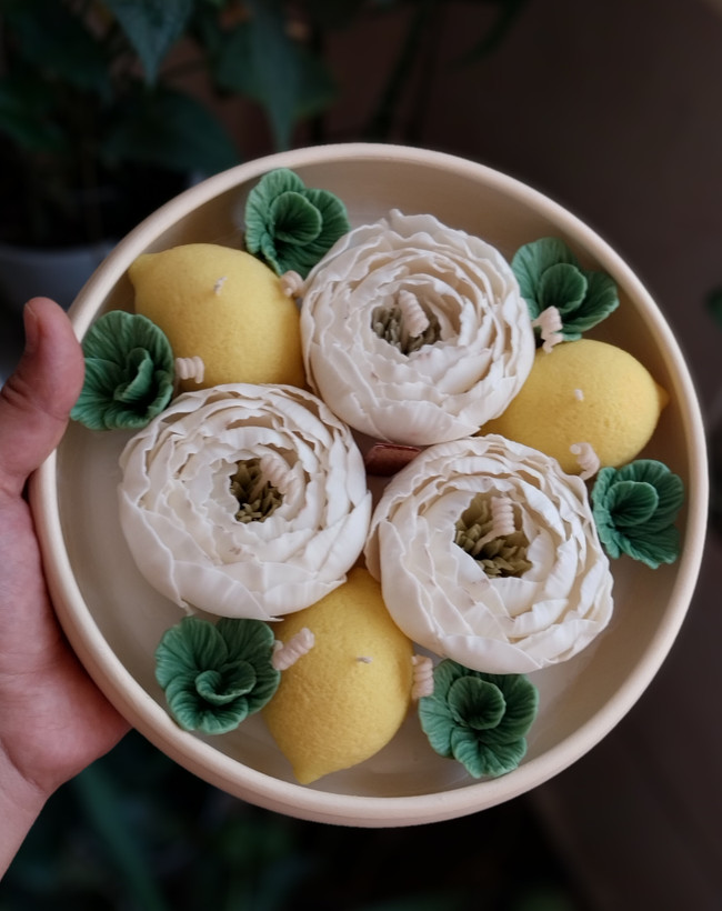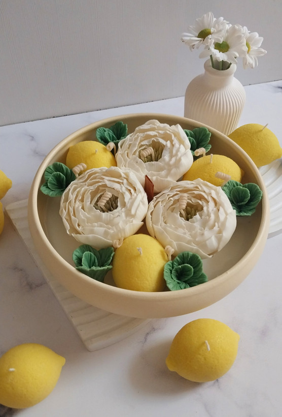 کاسه شمع سفالی کرم با ترکیب گل پیونی دست ساز و شمع لیمو و رایحه مطبوع لیمو🍋