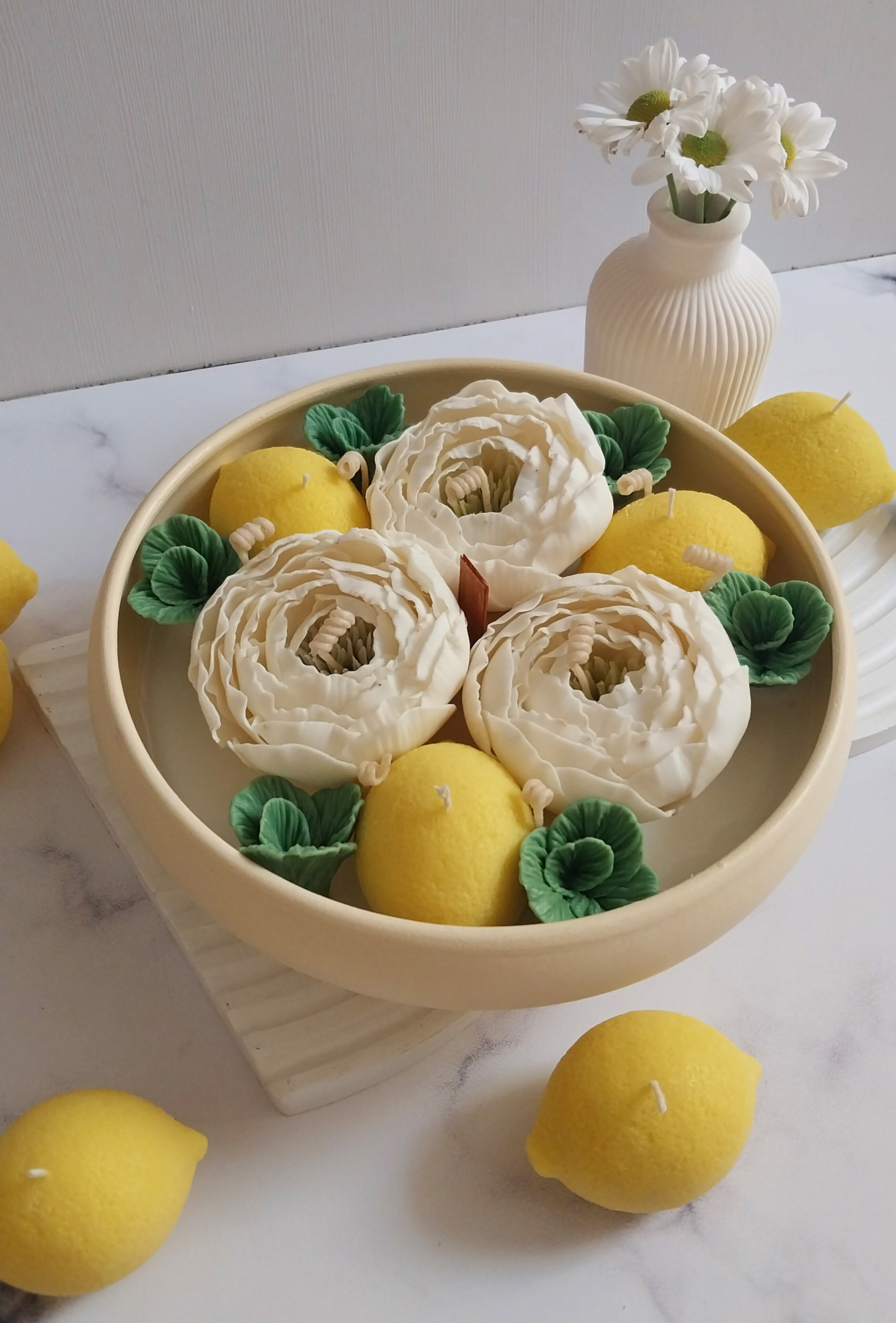کاسه شمع سفالی کرم با ترکیب گل پیونی دست ساز و شمع لیمو و رایحه مطبوع لیمو🍋