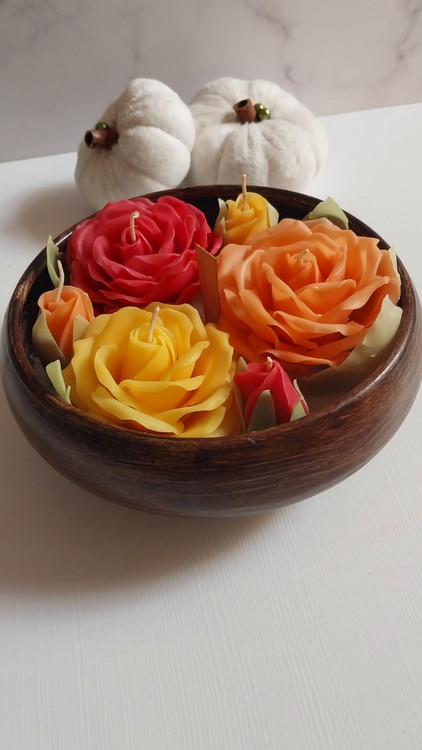 دارای سه عدد گل رز دست ساز قرمز، نارنجی و زرد همراه سه غنچه گل رز